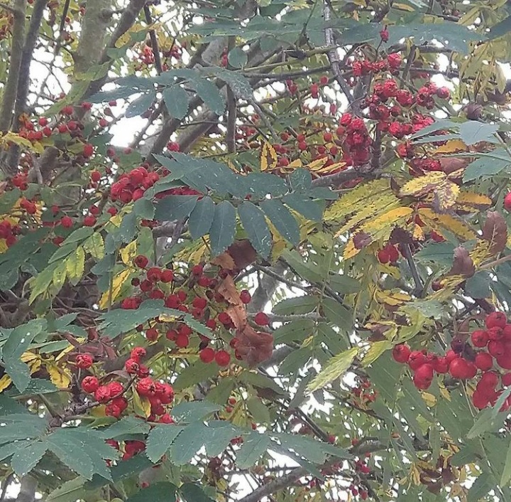 Na foto se vê como são marcantes os contrastes entre o amarelo (amarelado) das folhas e o laranja( avermelhado) que ressaltam os frutos vermelhos de algumas árvores.