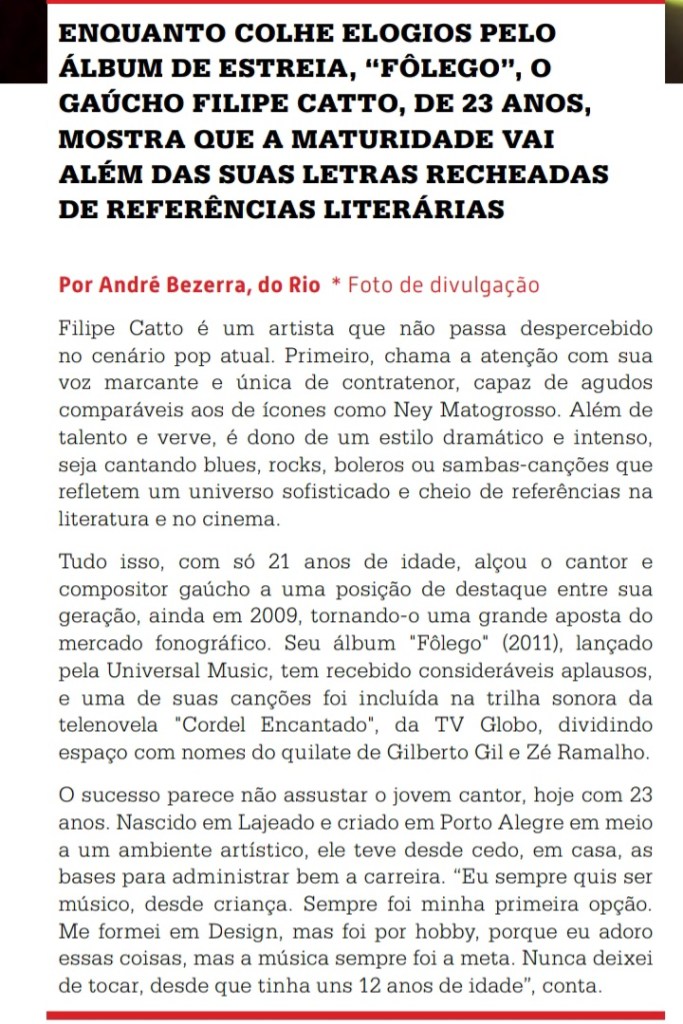 Em nossa 5a e última parte para celebrar os 10 anos de lançamento do primeiro CD de Filipe, FÔLEGO, trazemos a matéria que foi publicada sobre o disco, na edição no. 12 da revista da UBC – União Brasileira de Compositores, de março de 2012, cujo título é: FÔLEGO PARA UM LONGO CAMINHO e foi assinada por André Bezerra.