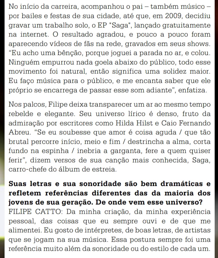 Em nossa 5a e última parte para celebrar os 10 anos de lançamento do primeiro CD de Filipe, FÔLEGO, trazemos a matéria que foi publicada sobre o disco, na edição no. 12 da revista da UBC – União Brasileira de Compositores, de março de 2012, cujo título é: FÔLEGO PARA UM LONGO CAMINHO e foi assinada por André Bezerra.