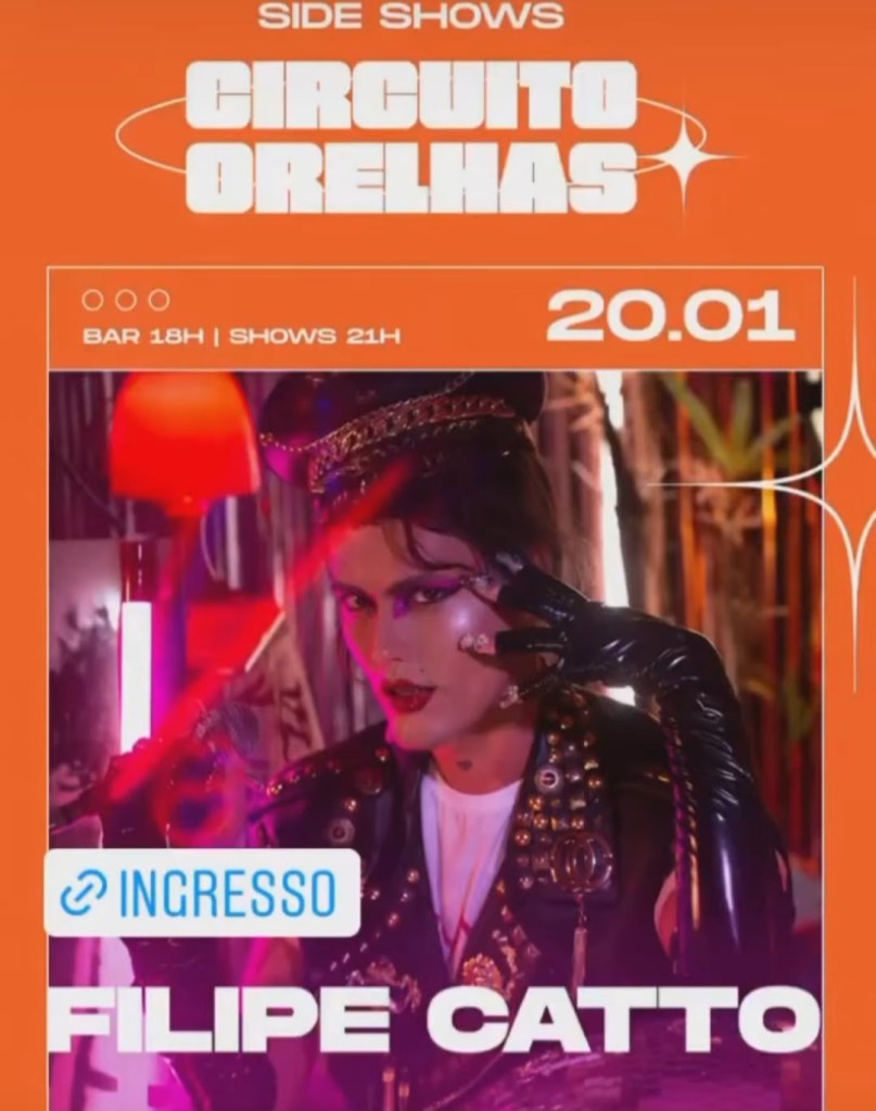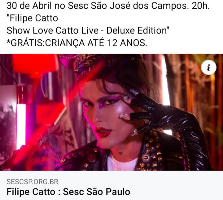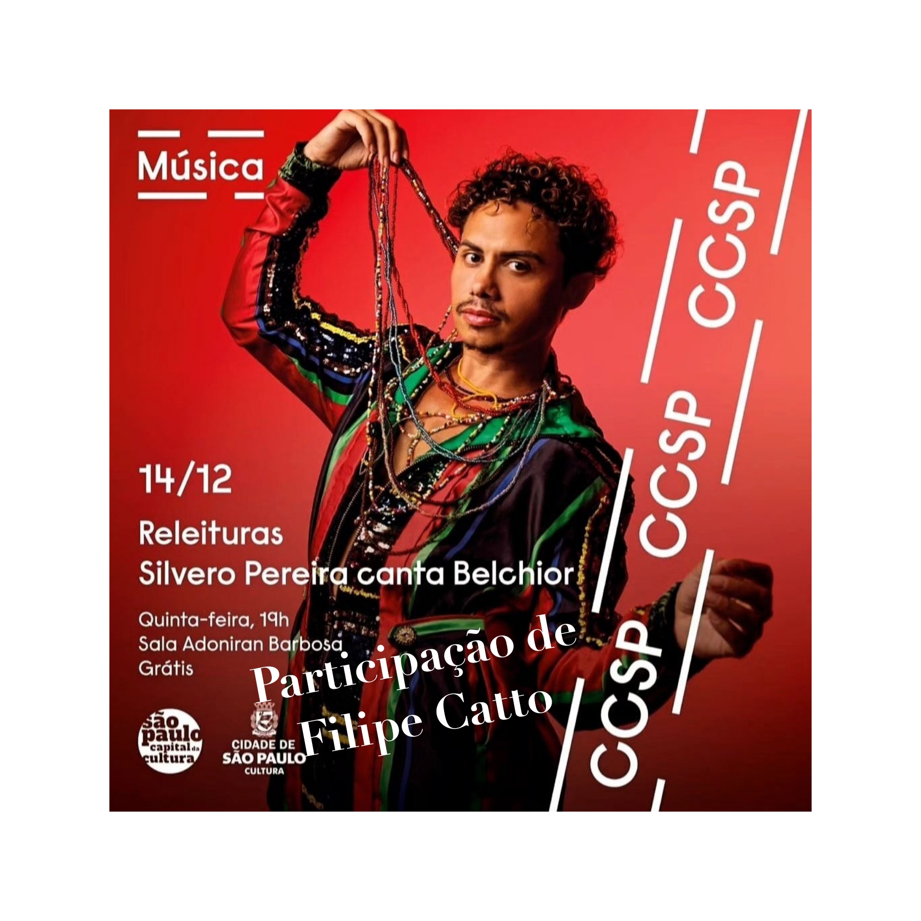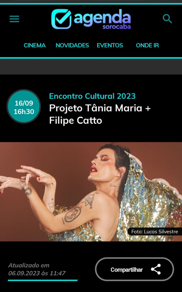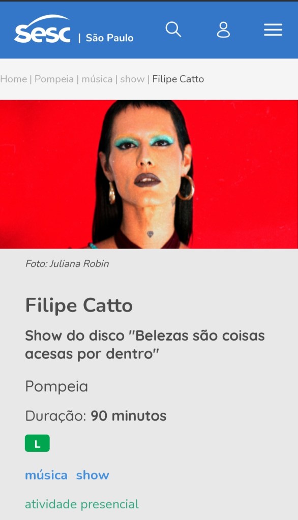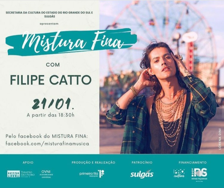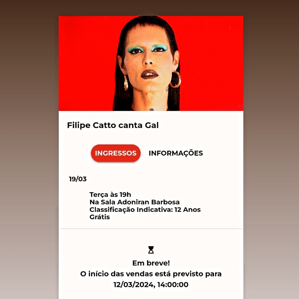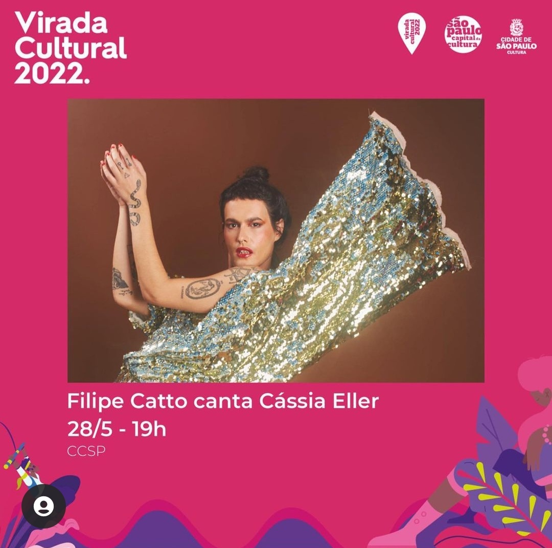 Música – 25/01/17 19h – Filipe Catto canta Cássia Eller livre – 60min – Sala Adoniran Barbosa grátis – a bilheteria será aberta duas horas antes do início do espetáculo para a retirada de ingressos – os ingressos não estarão disponíveis pela internet – cada pessoa poderá retirar até dois ingressos