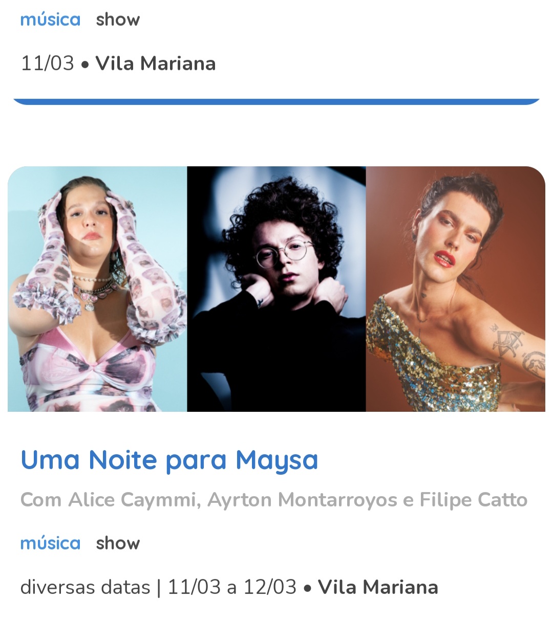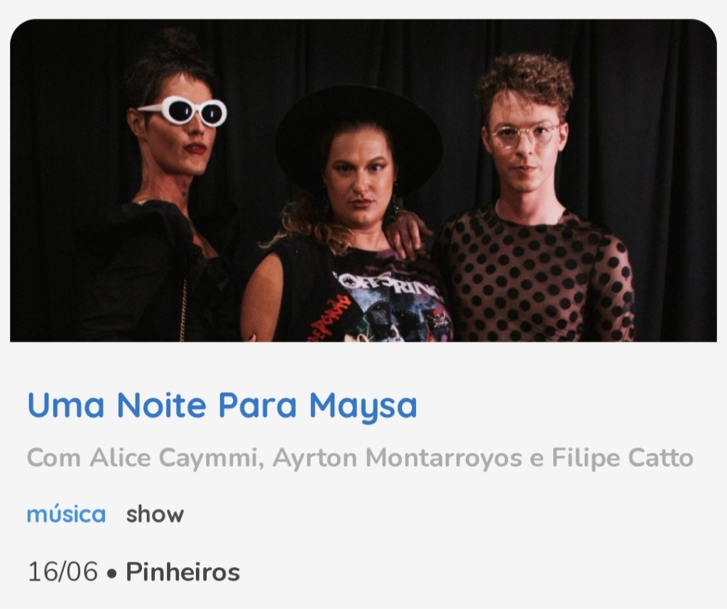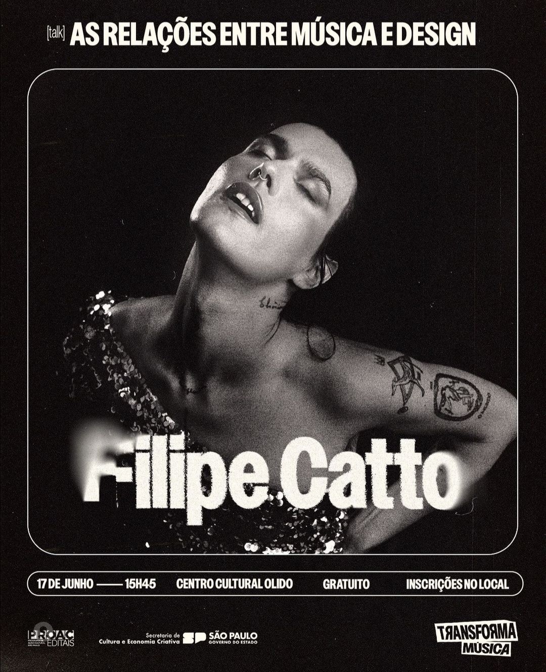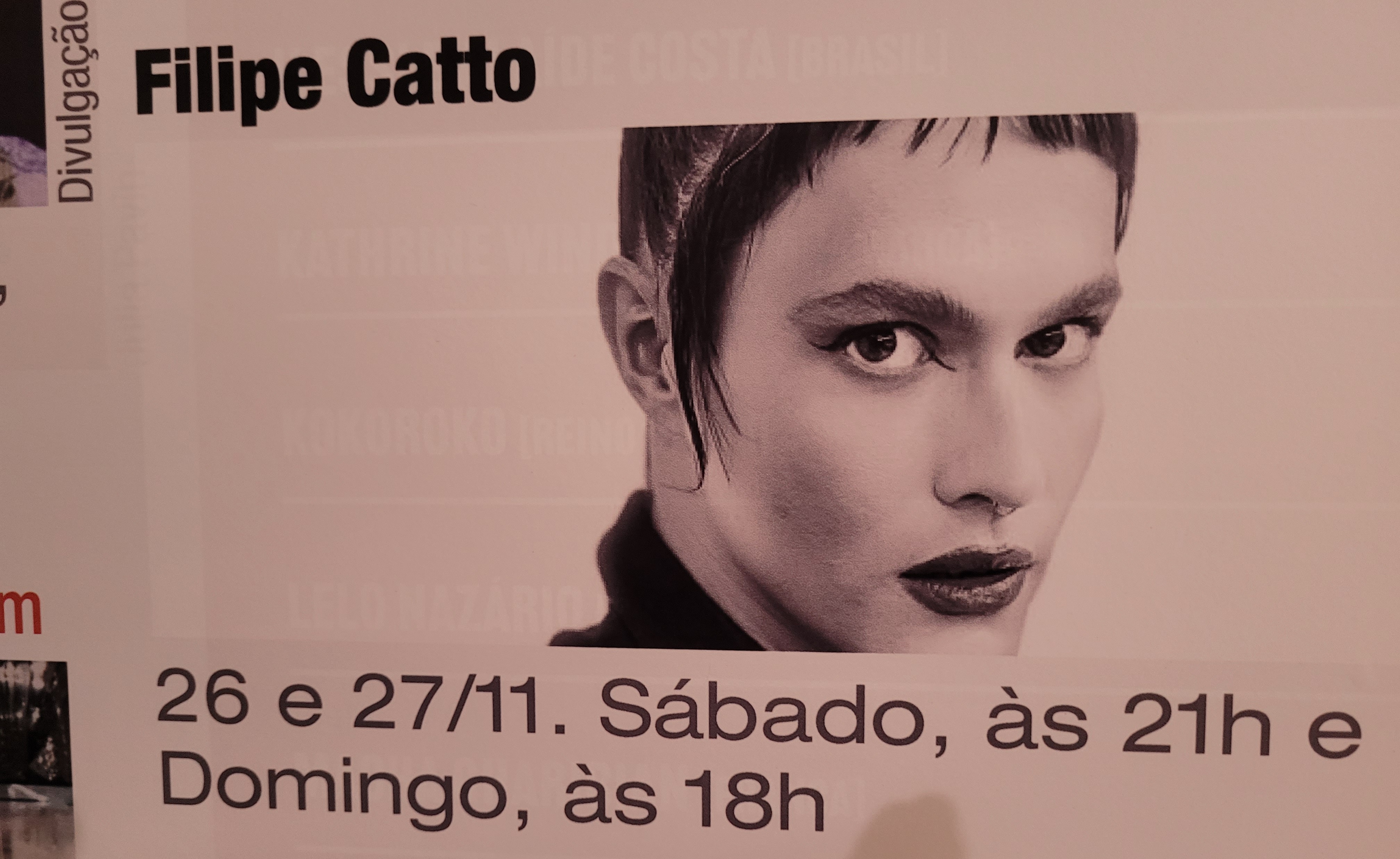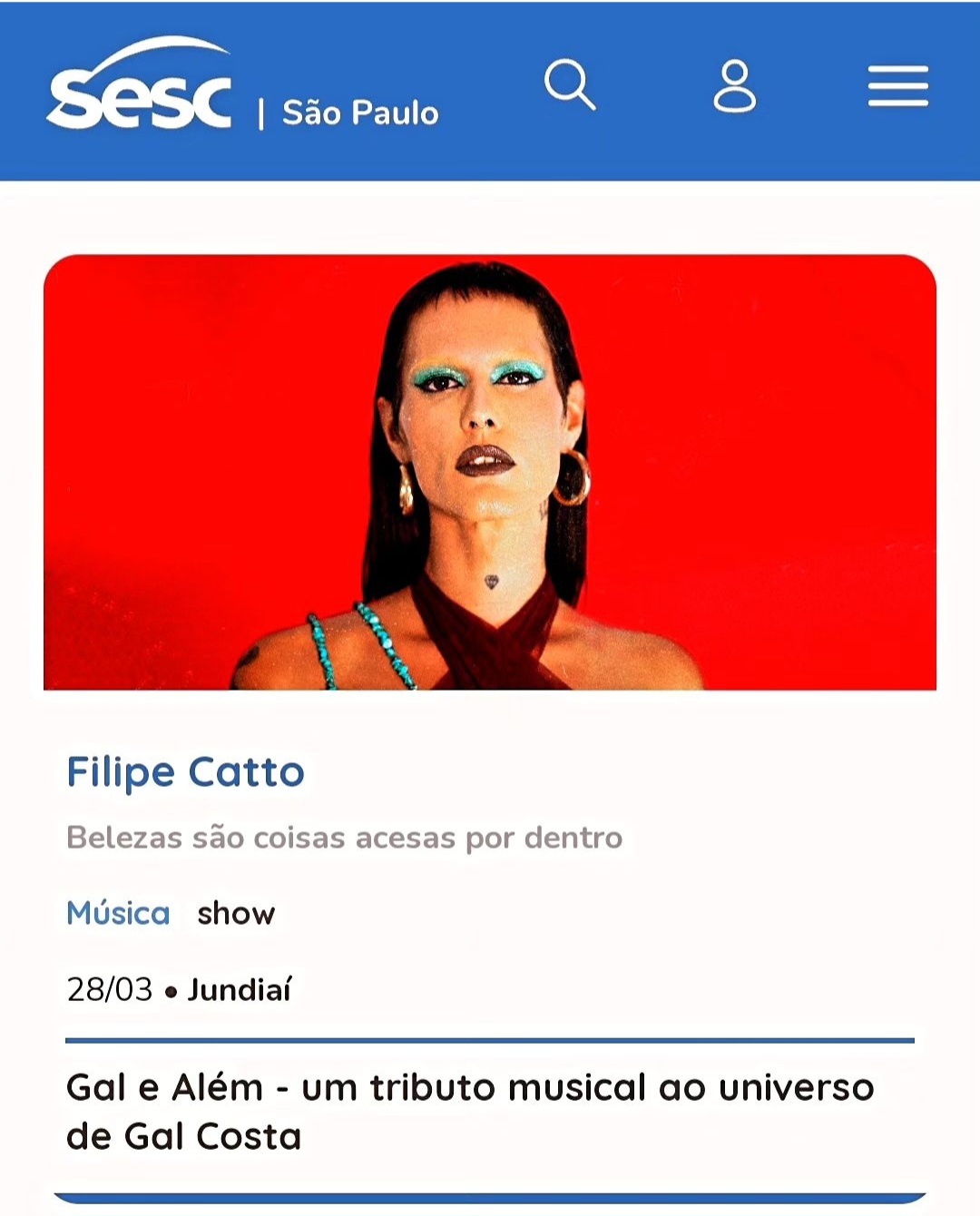 Música – 25/01/17 19h – Filipe Catto canta Cássia Eller livre – 60min – Sala Adoniran Barbosa grátis – a bilheteria será aberta duas horas antes do início do espetáculo para a retirada de ingressos – os ingressos não estarão disponíveis pela internet – cada pessoa poderá retirar até dois ingressos