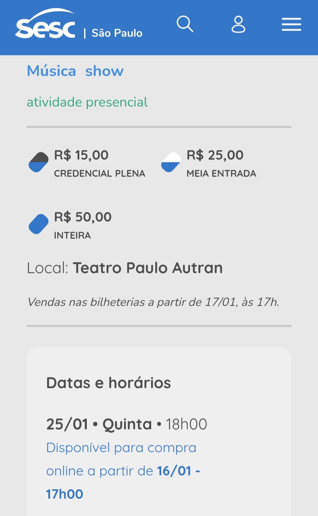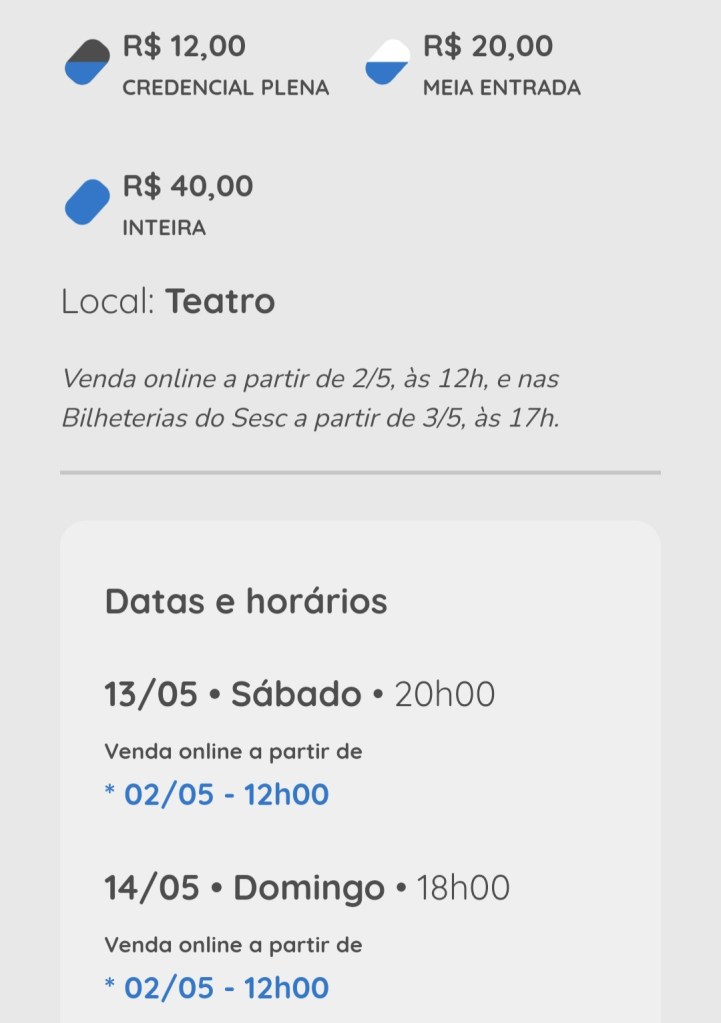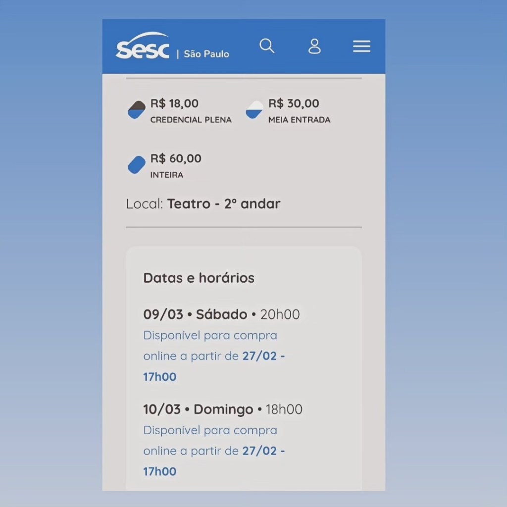Ingressos pelo site do Sesc SP ou diretamente em cada um dos Sescs do estado.