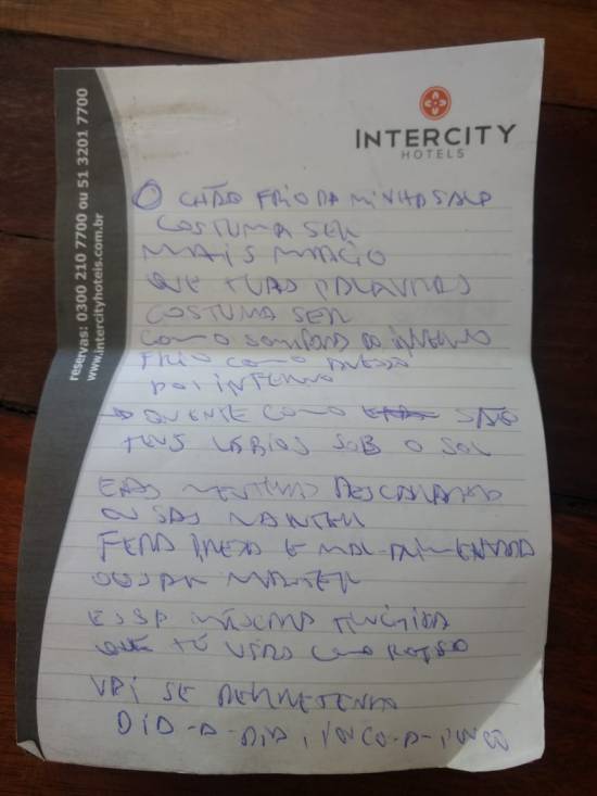 Um dos momentos mais lindos da criação artística é quando a inspiração chega e o artista registra a “chama”. Aqui, o primeiro rascunho da letra de “Eu não quero mais” feita por um dos seus autores, Juliano Holanda, em um hotel de São Paulo. Agradecemos a ele por ter compartilhado com a gente essa preciosidade […]